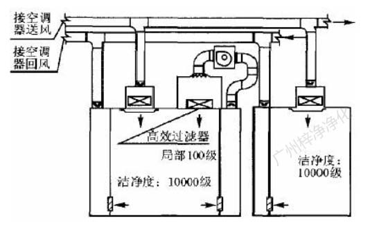 第三種方式,萬級區潔凈房間內含局部百級區。此種情況在藥品生產廠房潔凈區內也比較多見。這種情況,局部百級區面積一般在10m2 以內。可以利用萬級凈化空調系統送風控制室內溫、濕度,補充新風。在局部百級區加大循環風量。循環風處理方式可以采取前述方式 一,即在局部百級區吊頂內作靜壓箱,百級區范圍內滿布FFU,利用FFU處理循環風,如圖3。循環風處理方式也可采取前述方式二,即在局部 百級區吊頂內作靜壓箱,百級區范圍內滿布高效過濾器,利用循環風機加壓,如圖4。
